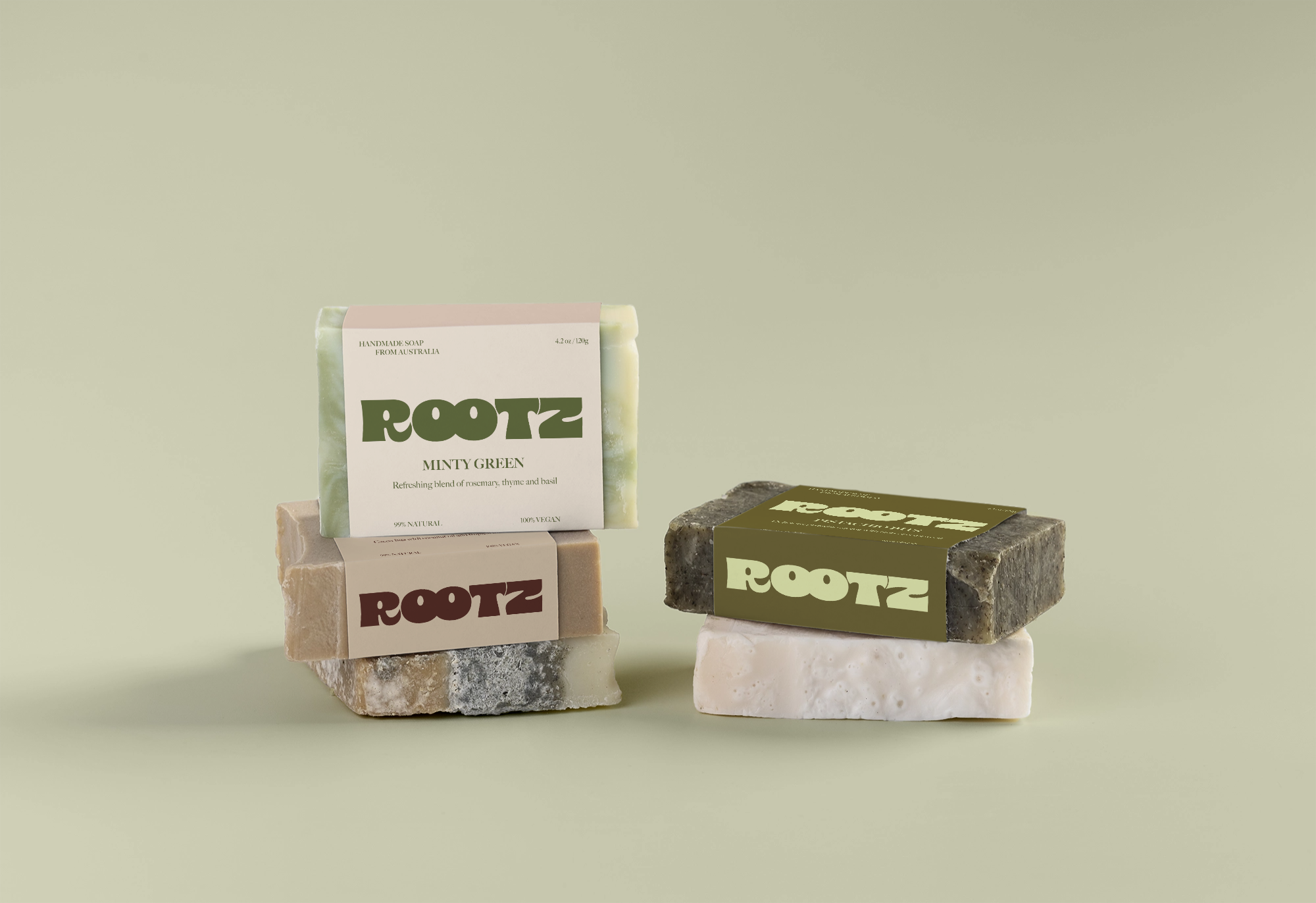 Rootz is a vegan soap brand based in Australia. We embraced the brand's commitment to natural, sustainable living through bold visual choices. The chunky, retro-inspired typography gives the brand a confident, authentic voice.