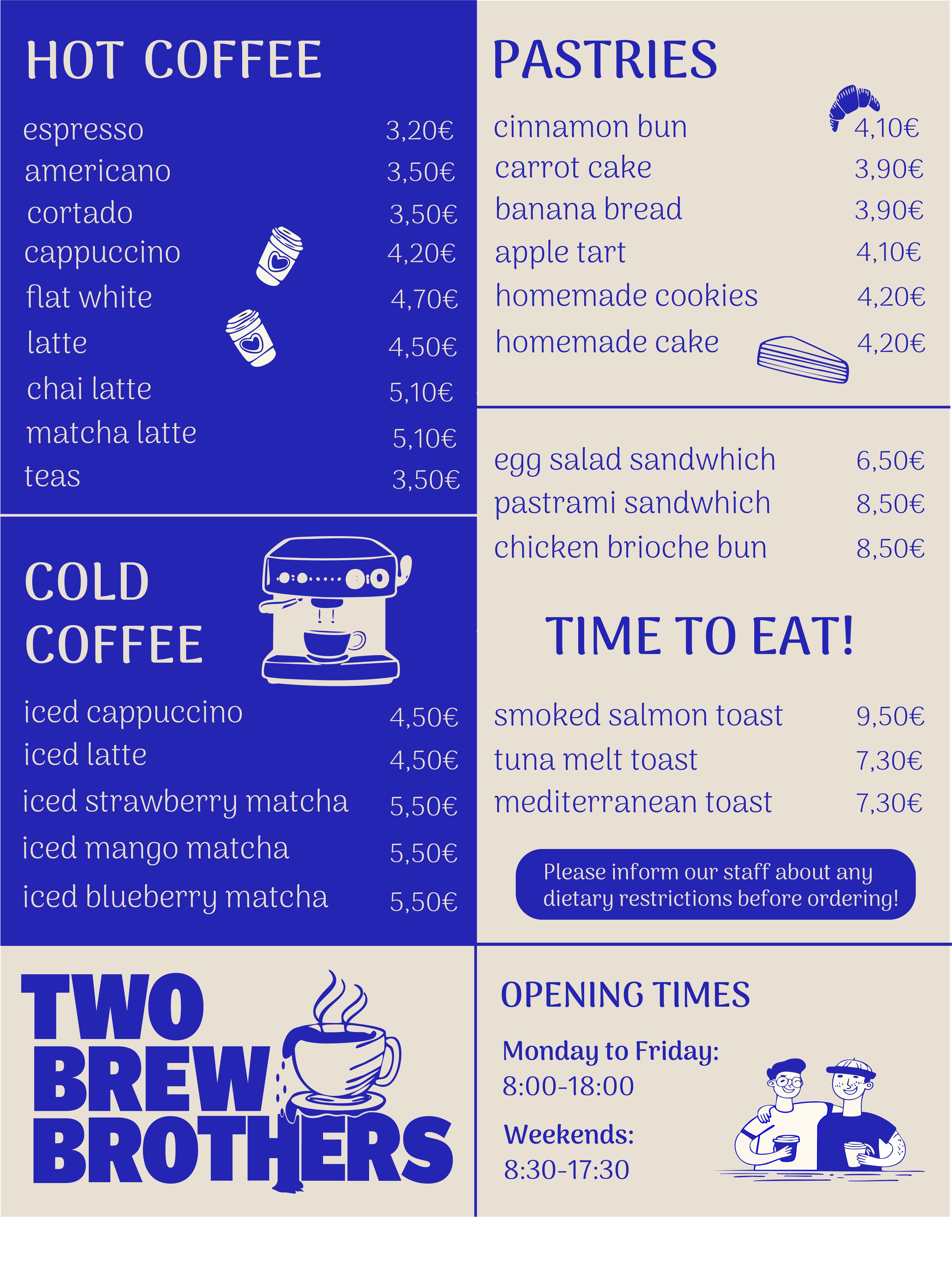 Two Brew Brothers is designed to feel like your neighborhood's best-kept secret— more than just a cafe. The visual language embraces hand-drawn illustrations and playful typography to convey warmth and approachability.